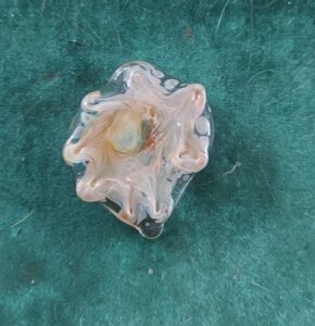 The Portal bone in my set, like many, is not technically a bone. It’s a glass medallion made for me by a friend I met while teaching at an arts camp a few years ago, as a thank-you for a reading I gave him. He made two lovely glass artifacts for my bone set, both of which were readily accepted by the other bones (yes, they do get a say in what enters and leaves the group). The bone is double-sided, and the two sides are very different in appearance and meaning. The “front” is a clear and crisp passageway, as shown in the photo at the top of the page. On the “back,” as shown here, there is a more amorphous, blob-like obstruction that resembles an attacking octopus.